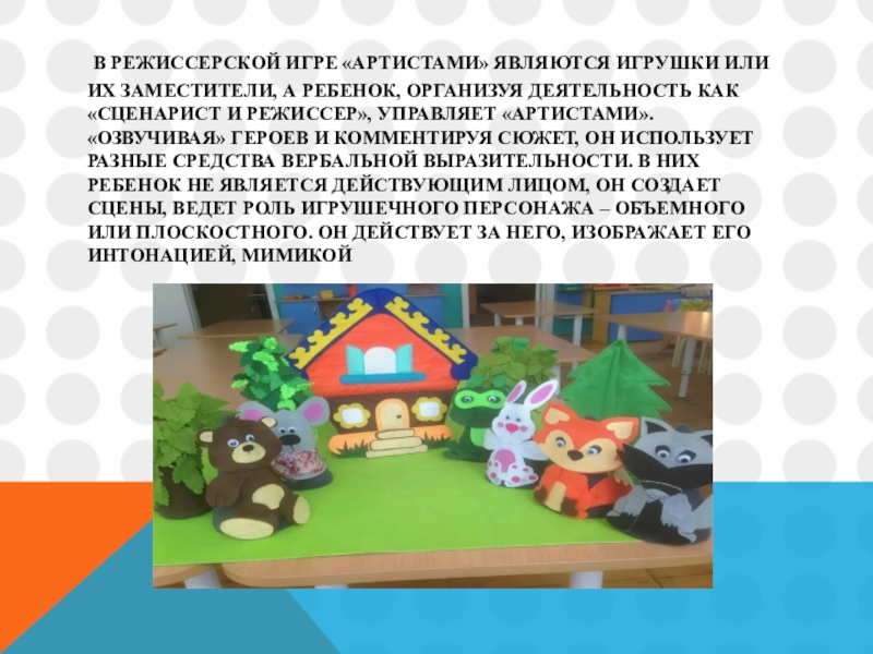 Слайд 8 В режиссерской игре «артистами» являются игрушки или их заместители,