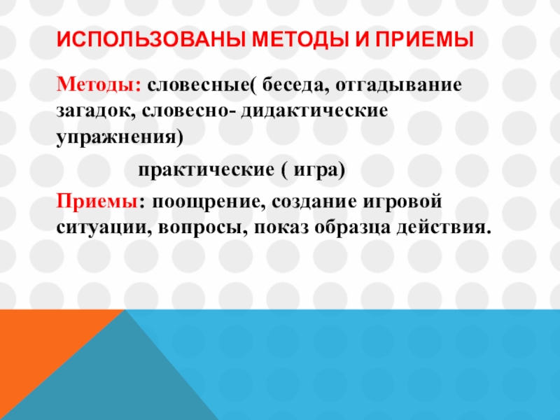 Использованы методы и приемыМетоды: словесные( беседа, отгадывание загадок, словесно- дидактические упражнения)
