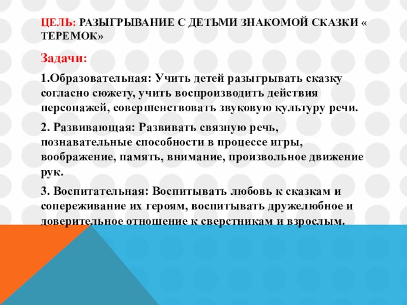 Слайд 10Цель: Разыгрывание с детьми знакомой сказки « Теремок»