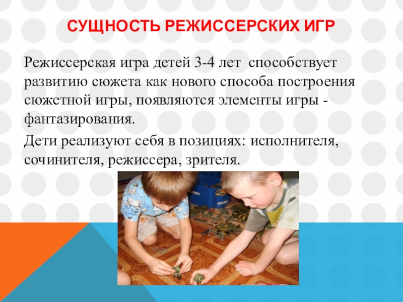 Сущность режиссерских игр  Режиссерская игра детей 3-4 лет способствует развитию сюжета как