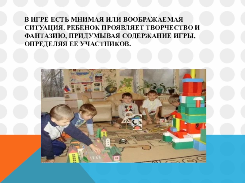 Слайд 5В игре есть мнимая или воображаемая ситуация. Ребенок проявляет творчество
