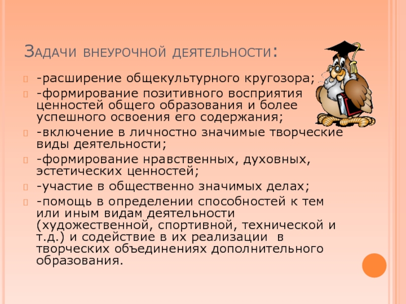 Задачи внеурочной деятельности:-расширение общекультурного кругозора;-формирование позитивного восприятия ценностей общего образования и более успешного освоения его содержания;-включение в
