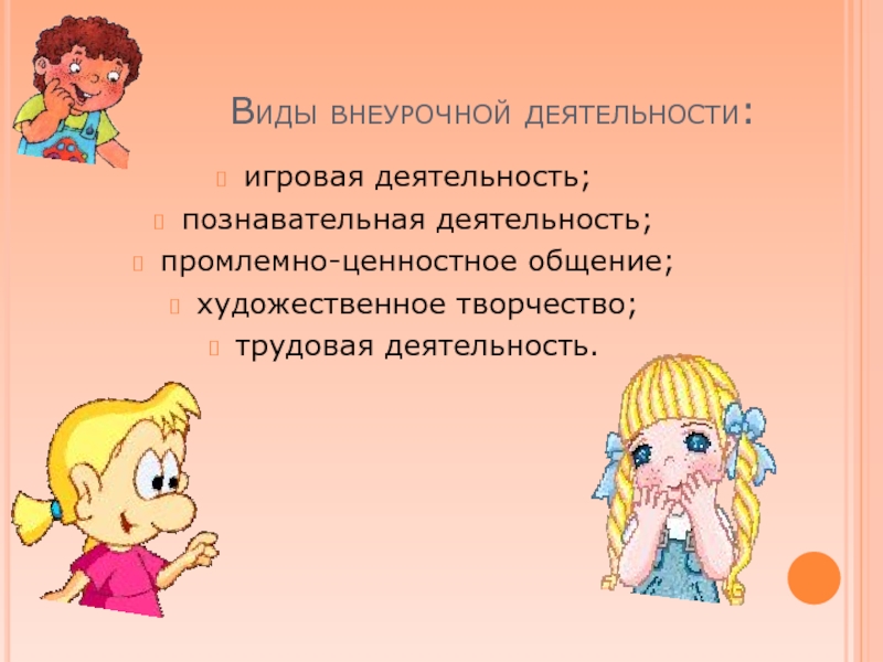 Виды внеурочной деятельности: игровая деятельность; познавательная деятельность; промлемно-ценностное общение; художественное творчество; трудовая деятельность.