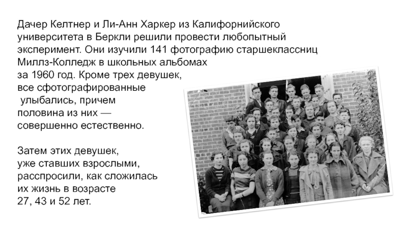 решили провести любопытный эксперимент. Они изучили 141 фотографию старшеклассниц Миллз-Колледж