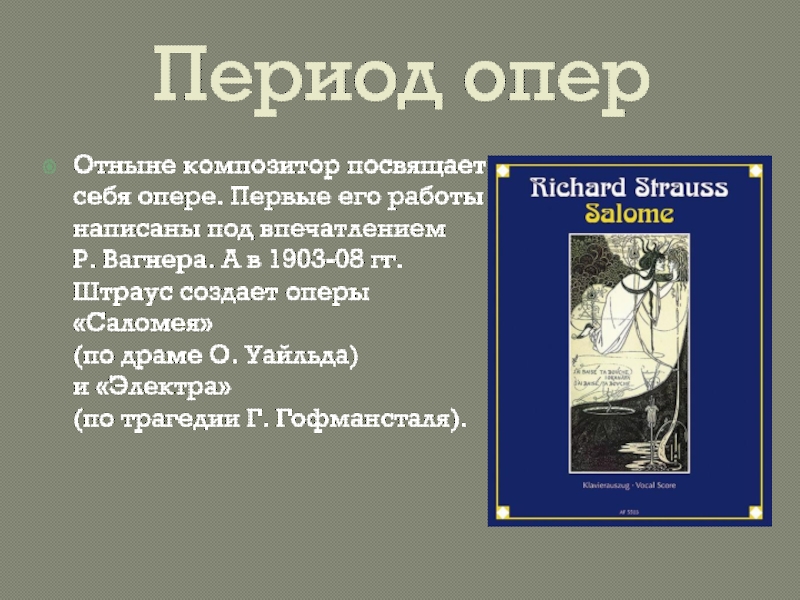 оперы «Саломея» (по драме О. Уайльда) и «Электра» (по трагедии Г. Гофмансталя).
