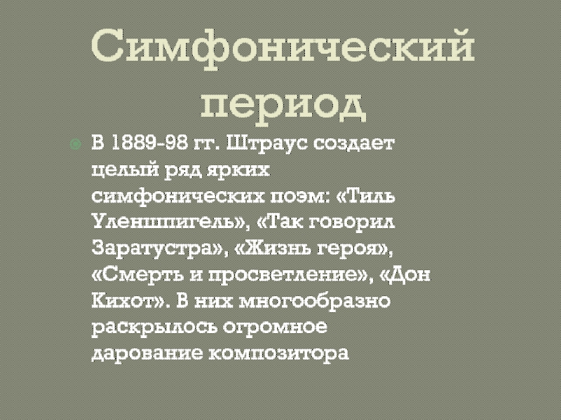 Симфонический периодВ 1889-98 гг. Штраус создает целый ряд ярких симфонических поэм: «Тиль Уленшпигель», «Так говорил Заратустра», «Жизнь