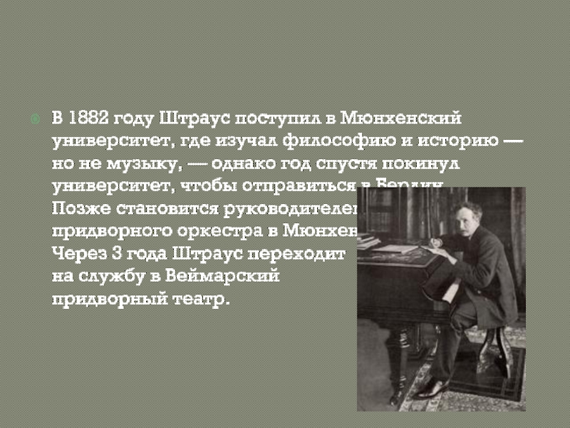 В 1882 году Штраус поступил в Мюнхенский университет, где изучал философию и историю — но не музыку, — однако год
