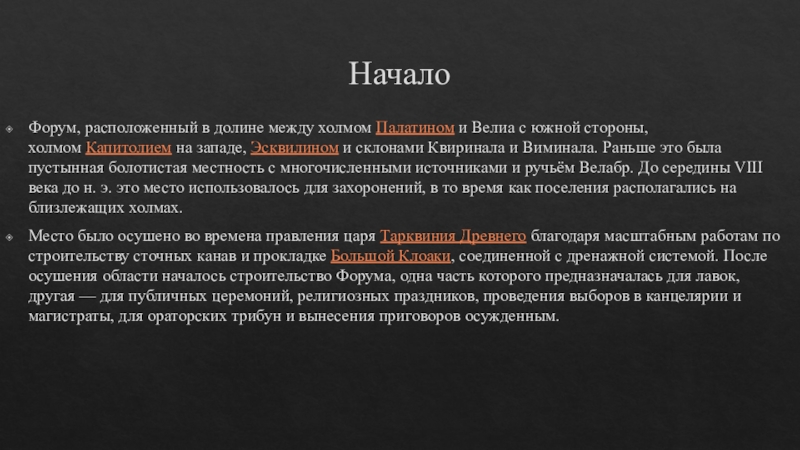 холмом Капитолием на западе, Эсквилином и склонами Квиринала и Виминала. Раньше это была пустынная