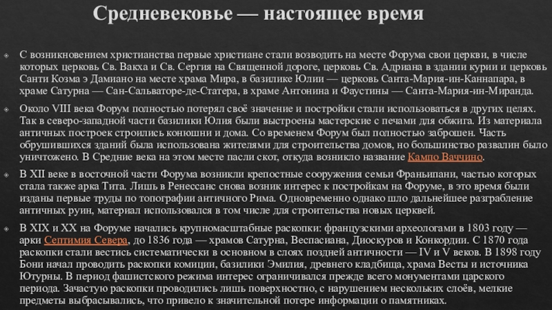 и Св. Сергия на Священной дороге, церковь Св. Адриана в здании курии и церковь Санти Козма э Дамиано на месте храма Мира, в базилике Юлии — церковь Санта-Мария-ин-Каннапара, в храме Сатурна — Сан-Сальваторе-де-Статера, в храме Антонина и Фаустины — Санта-Мария-ин-Миранда.