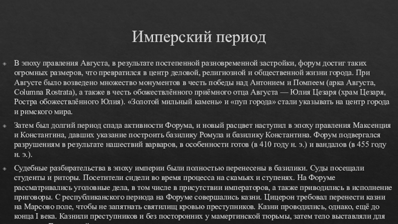 религиозной и общественной жизни города. При Августе было возведено множество монументов в честь победы над Антонием и Помпеем (арка Августа, Columna Rostrata), а также в честь обожествлённого приёмного отца Августа — Юлия Цезаря (храм Цезаря, Ростра обожествлённого Юлия). «Золотой мильный камень» и «пуп города» стали указывать на центр города и римского мира.