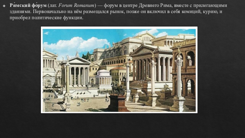 Слайд 2Ри́мский фо́рум (лат. Forum Romanum) — форум в центре Древнего Рима, вместе с прилегающими зданиями. Первоначально
