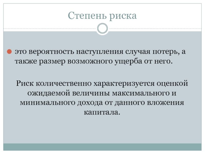 Степень рискаэто вероятность наступления случая потерь, а также размер возможного ущерба от него. Риск количественно характеризуется оценкой