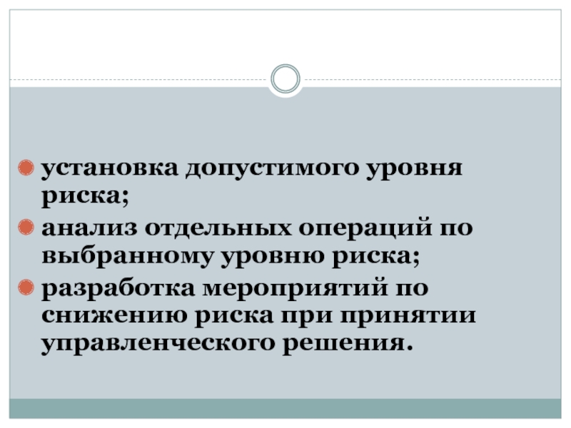 установка допустимого уровня риска;анализ отдельных операций по выбранному уровню риска;разработка мероприятий по снижению риска при принятии управленческого