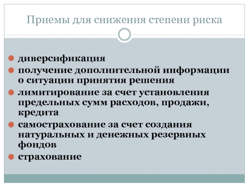 Приемы для снижения степени рискадиверсификацияполучение дополнительной информации о ситуации принятия решениялимитирование за счет установления предельных сумм расходов,