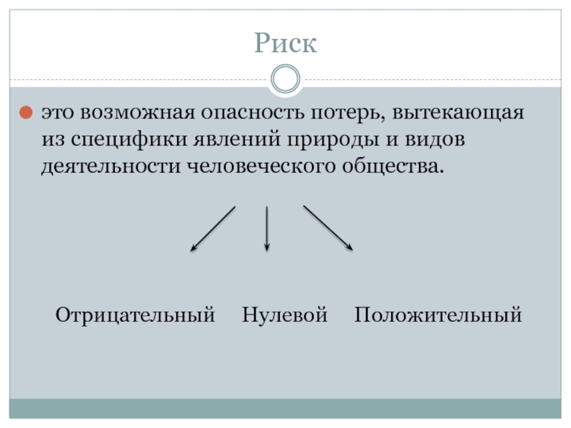 Рискэто возможная опасность потерь, вытекающая из специфики явлений природы и видов деятельности человеческого общества.  Отрицательный Нулевой Положительный