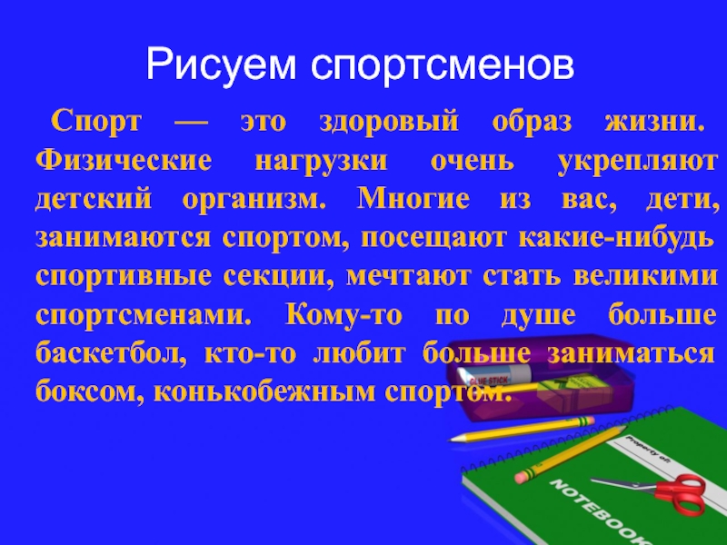 Рисуем спортсменов Спорт — это здоровый образ жизни. Физические нагрузки очень укрепляют детский организм. Многие из вас,