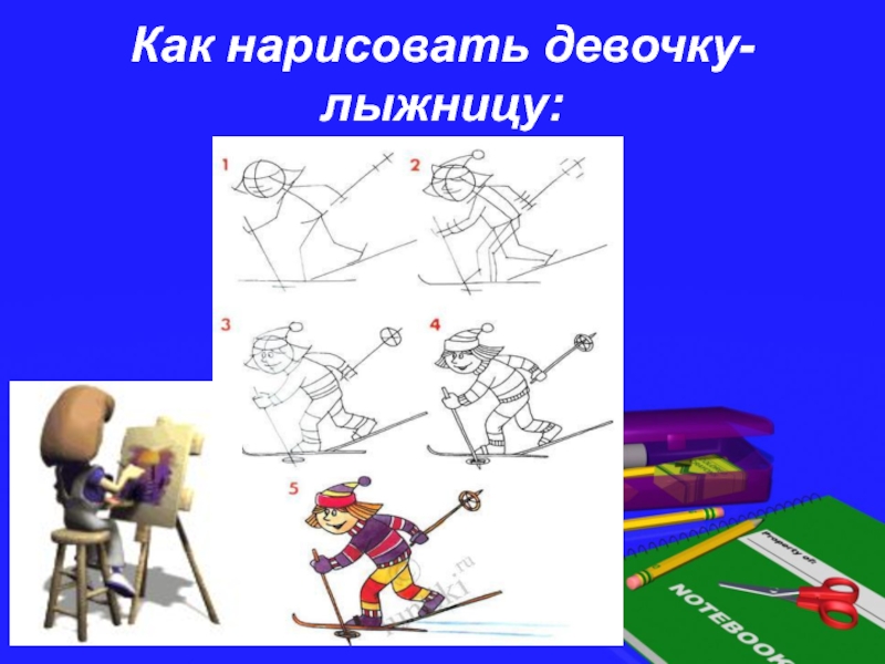 Слайд 7Как нарисовать девочку-лыжницу: