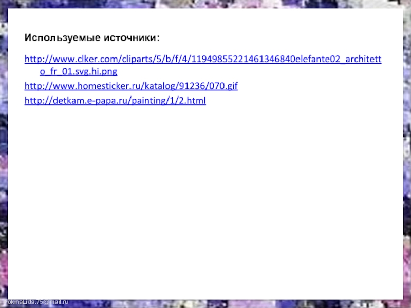 Используемые источники:http://www.clker.com/cliparts/5/b/f/4/11949855221461346840elefante02_architetto_fr_01.svg.hi.pnghttp://www.homesticker.ru/katalog/91236/070.gifhttp://detkam.e-papa.ru/painting/1/2.html