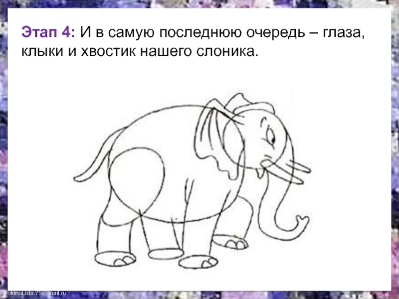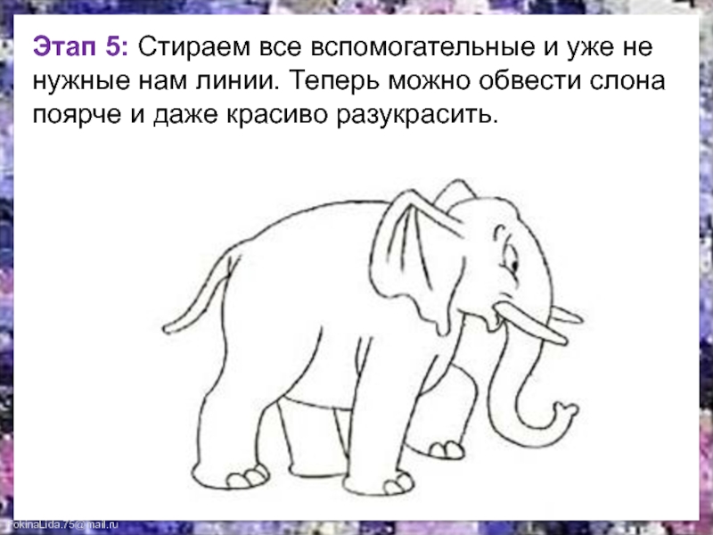 Этап 5: Стираем все вспомогательные и уже не нужные нам линии. Теперь можно обвести слона поярче и