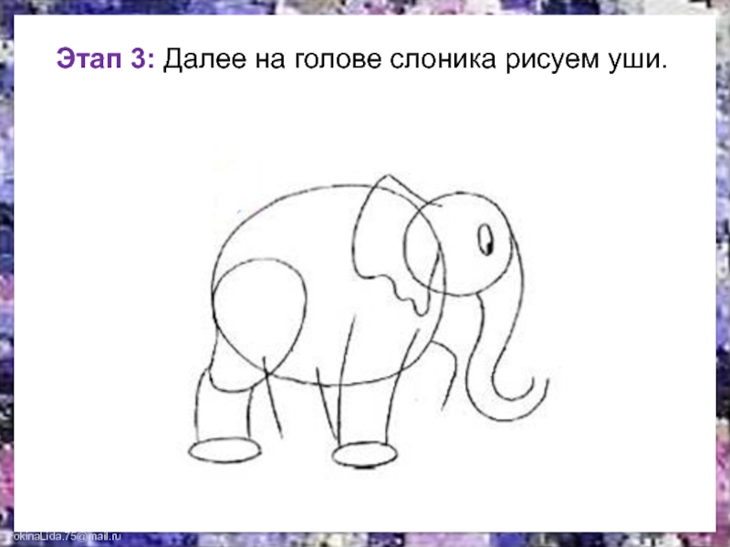 Слайд 5Этап 3: Далее на голове слоника рисуем уши.