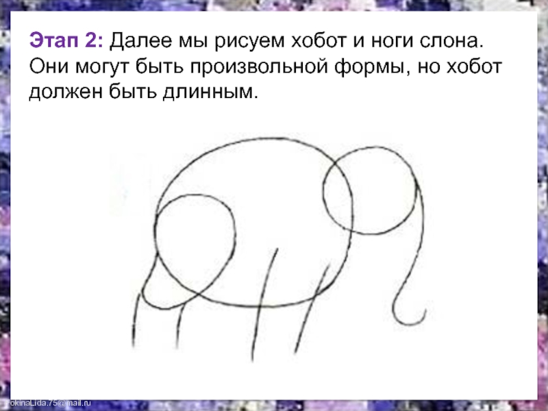 Слайд 4Этап 2: Далее мы рисуем хобот и ноги слона. Они