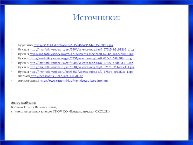 Источники: Буратино http://cs11141.vkontakte.ru/u15946340/-14/x_f53b8c17.jpgбуква а http://img-fotki.yandex.ru/get/5904/valenta-mog.ba/0_675b5_b9c922b6_L.jpgбуква з http://img-fotki.yandex.ru/get/4703/valenta-mog.ba/0_675bc_46bc2d80_L.jpgбуква с http://img-fotki.yandex.ru/get/5704/valenta-mog.ba/0_675c6_619c92b_L.jpgбуква т http://img-fotki.yandex.ru/get/5004/valenta-mog.ba/0_675c7_a2df39a3_L.jpg буква ь http://img-fotki.yandex.ru/get/5604/valenta-mog.bb/0_675d1_314ad6e1_L.jpgбуква я http://img-fotki.yandex.ru/get/5803/valenta-mog.bb/0_675d4_ee63f3ca_L.jpgшаблон http://pedsovet.su/load/424-1-0-28532иллюстрации http://www.razumniki.ru/kak_risovat_buratino.htmlАвтор шаблона:Бобкова Ирина Валентиновна, учитель начальных классов ГКОУ СО «Богдановичская СКОШИ»