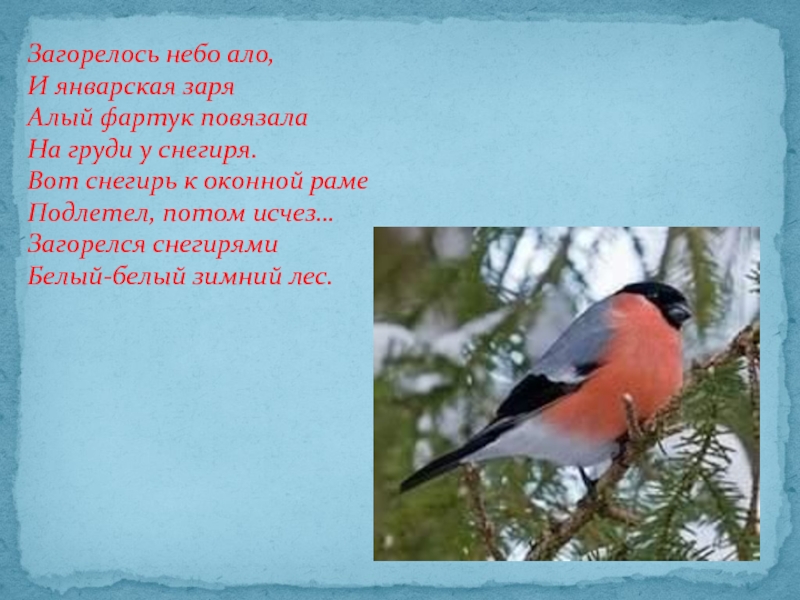 Слайд 5Загорелось небо ало, И январская заря Алый фартук повязала На груди у снегиря. Вот