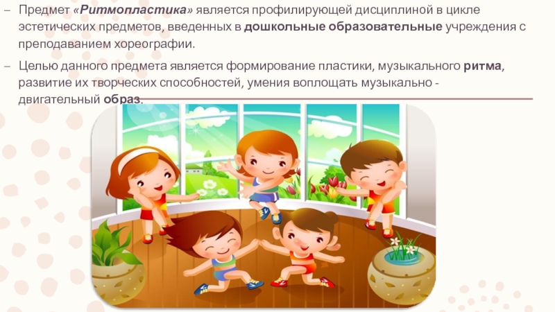 Слайд 2Предмет «Ритмопластика» является профилирующей дисциплиной в цикле эстетических предметов, введенных в дошкольные образовательные учреждения