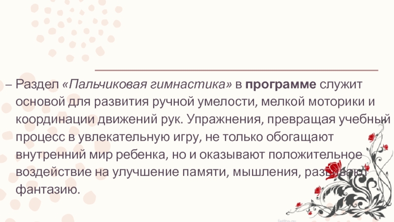 Слайд 10Раздел «Пальчиковая гимнастика» в программе служит основой для развития ручной умелости, мелкой моторики и