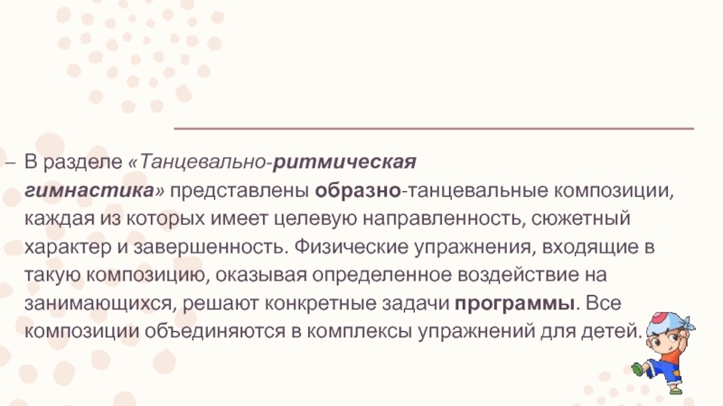 Слайд 8В разделе «Танцевально-ритмическая гимнастика» представлены образно-танцевальные композиции, каждая из которых имеет целевую направленность,