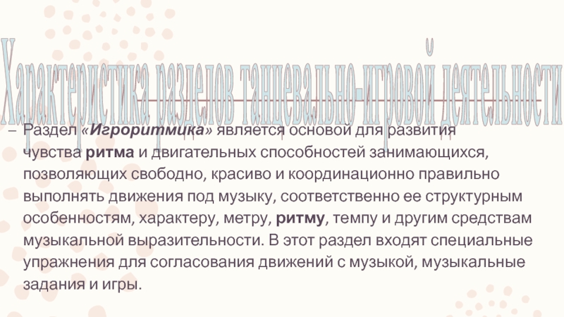 Слайд 6Характеристика разделов танцевально-игровой деятельности