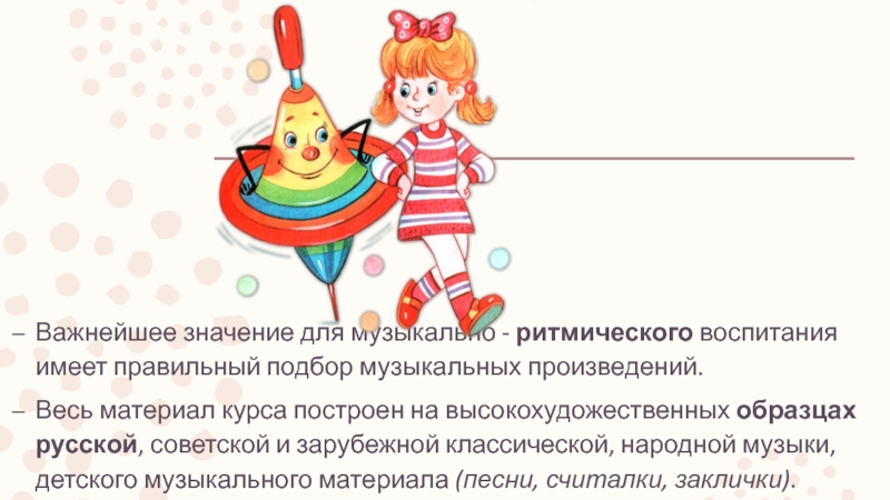 Слайд 5Важнейшее значение для музыкально - ритмического воспитания имеет правильный подбор музыкальных произведений.