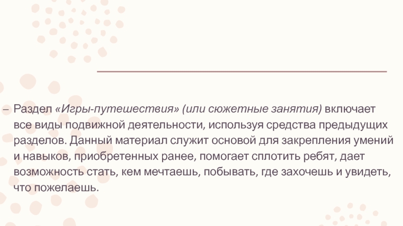 Слайд 12Раздел «Игры-путешествия» (или сюжетные занятия) включает все виды подвижной деятельности, используя средства предыдущих