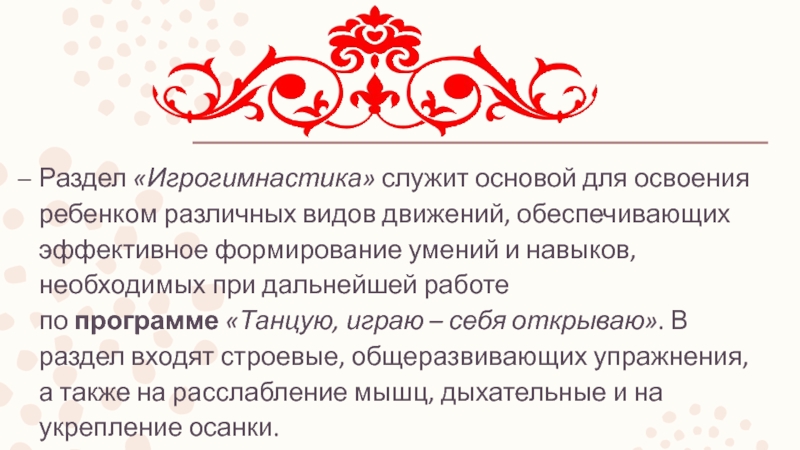 Слайд 7Раздел «Игрогимнастика» служит основой для освоения ребенком различных видов движений, обеспечивающих эффективное