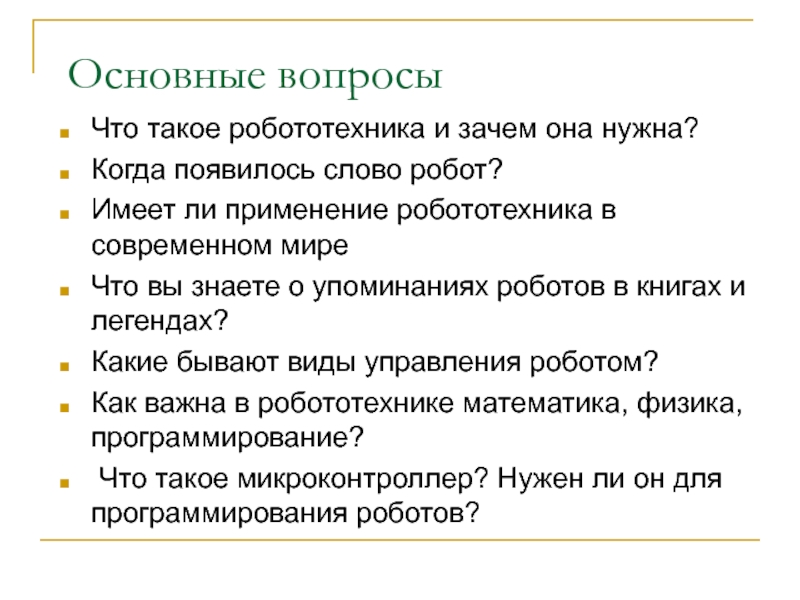 Основные вопросыЧто такое робототехника и зачем она нужна?Когда появилось слово робот?Имеет ли применение робототехника в современном миреЧто