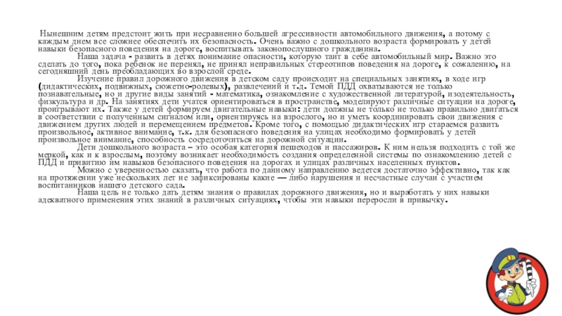 Наша задача - развить в детях понимание опасности, которую таит в себе автомобильный мир. Важно это сделать до того, пока ребенок не перенял, не принял неправильных стереотипов поведения на дороге, к сожалению, на сегодняшний день преобладающих во взрослой среде.