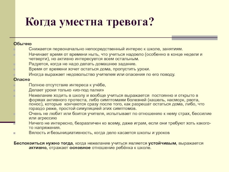 Беспокоиться нужно тогда, когда нежелание учиться является устойчивым, выражается активно, отражает основное отношение ребёнка к школе.