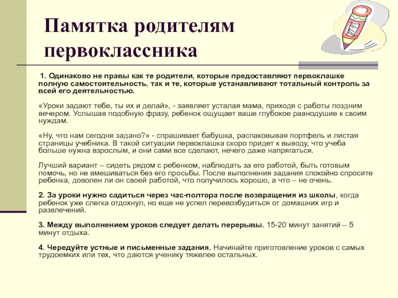 4. Чередуйте устные и письменные задания. Начинайте приготовление уроков с самых трудоемких или тех, что даются ученику тяжелее остальных.