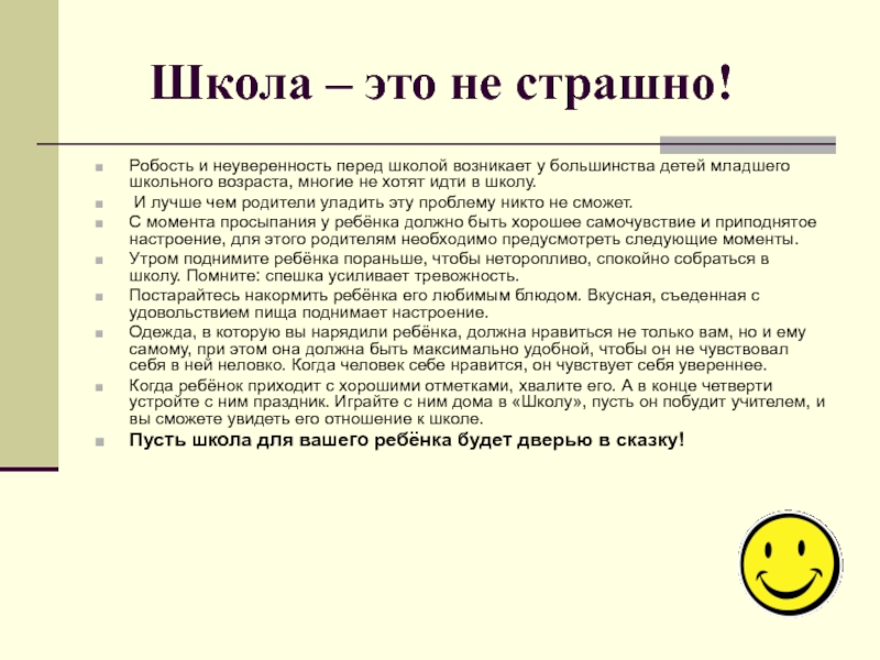Утром поднимите ребёнка пораньше, чтобы неторопливо, спокойно собраться в школу. Помните: спешка усиливает тревожность.