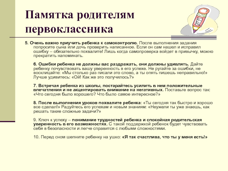 сам нашел и исправил ошибку – обязательно похвалите! Лишь когда самопроверка войдет в привычку, можно прекратить напоминать.