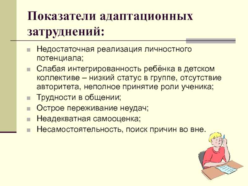 Дезадаптационный – плохое эмоциональное самочувствие; невротические реакции (неумение приспосабливаться к школьной жизни).