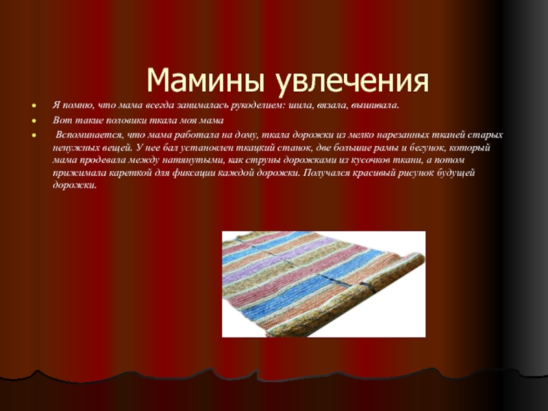 на дому, ткала дорожки из мелко нарезанных тканей старых ненужных вещей. У нее бал установлен ткацкий станок, две большие рамы и бегунок, который мама продевала между натянутыми, как струны дорожками из кусочков ткани, а потом прижимала кареткой для фиксации каждой дорожки. Получался красивый рисунок будущей дорожки.