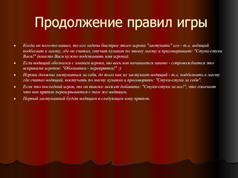 Задача водящего: найти и застукать всех игроков. Первый застуканый будет следующим водящим, если последний из игроков не застукает за всех.