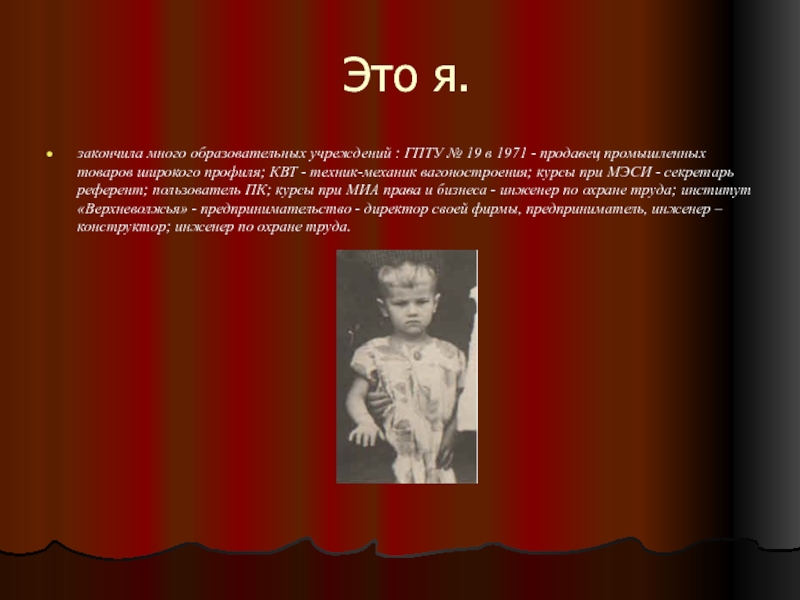 вагоностроения; курсы при МЭСИ - секретарь референт; пользователь ПК; курсы при МИА права и бизнеса - инженер по охране труда; институт «Верхневолжья» - предпринимательство - директор своей фирмы, предприниматель, инженер – конструктор; инженер по охране труда.