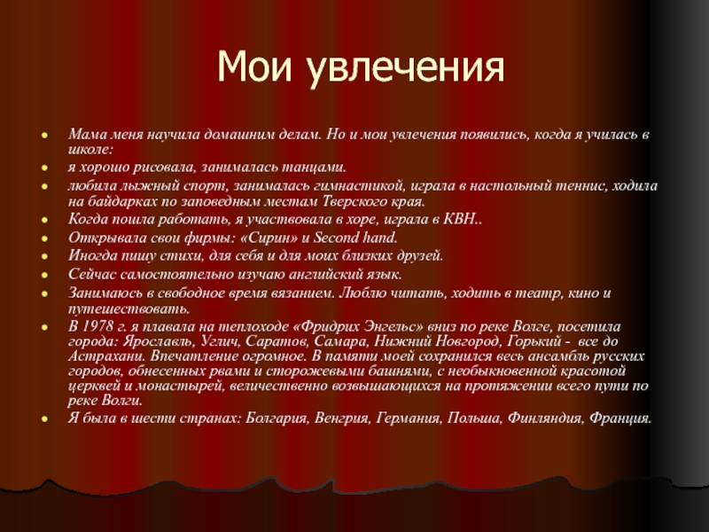 Занимаюсь в свободное время вязанием. Люблю читать, ходить в театр, кино и путешествовать.