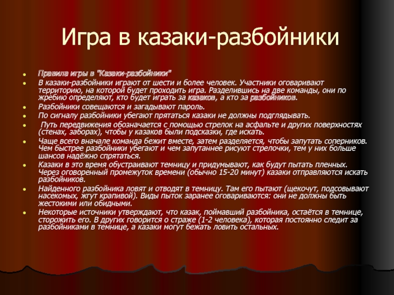 игра. Разделившись на две команды, они по жребию определяют, кто будет играть за казаков, а кто за разбойников.