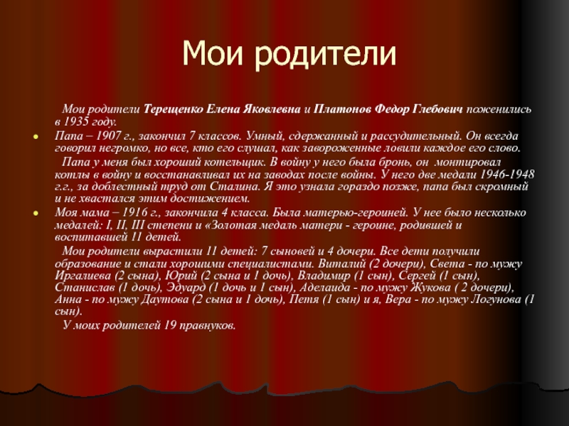 Моя мама – 1916 г., закончила 4 класса. Была матерью-героиней. У нее было несколько медалей: I, II, III степени и «Золотая медаль матери - героине, родившей и воспитавшей 11 детей.