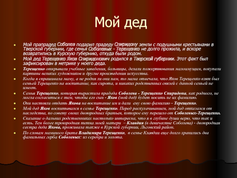 Семья Терещенко, которая вырастила прадеда Соболева - Терещенко Спиридона, как родного, не могла согласиться с тем, чтобы его сын - Яков (мой дед) будет носить не их фамилию.