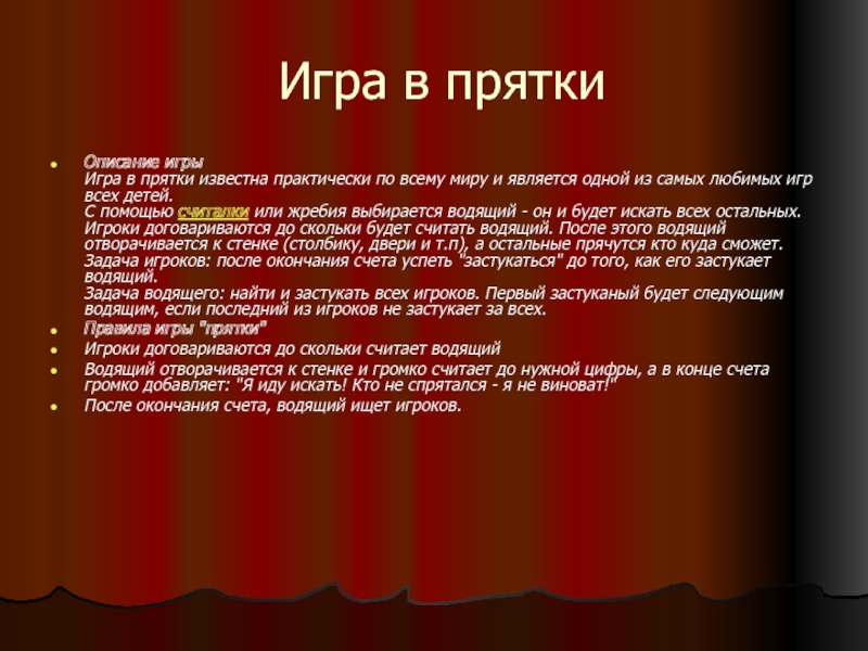 помощью считалки или жребия выбирается водящий - он и будет искать всех остальных.