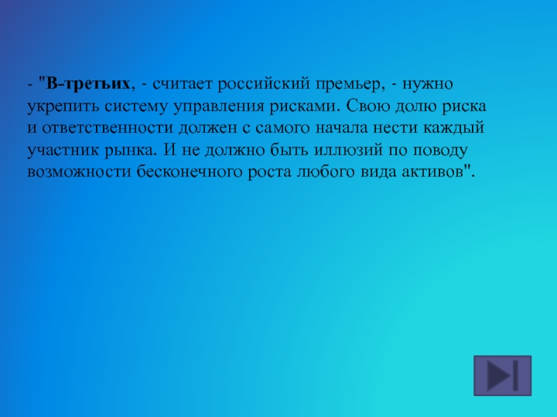 Слайд 32- "В-третьих, - считает российский премьер, - нужно укрепить систему